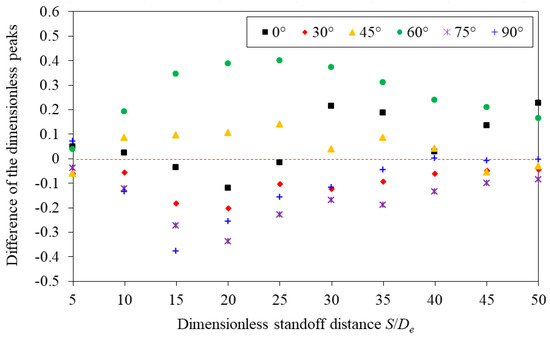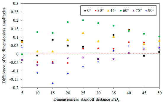 The differences in dimensionless amplitudes against dimensionless standoff distance.
