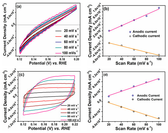 The current vs. potential result at diverse scan rates and The capacitance current (JC). (a) The CV curve of Co3Se4 on GC with different scan rate. (b) Jc of Co3Se4 on GC at Jnet = 0 mA cm−2 depending on scan rates. (c) The CV curve of Co3Se4 on FTO with different scan rate. (d) Jc of Co3Se4 on FTO at Jnet = 0 mA cm−2 depending on scan rates.