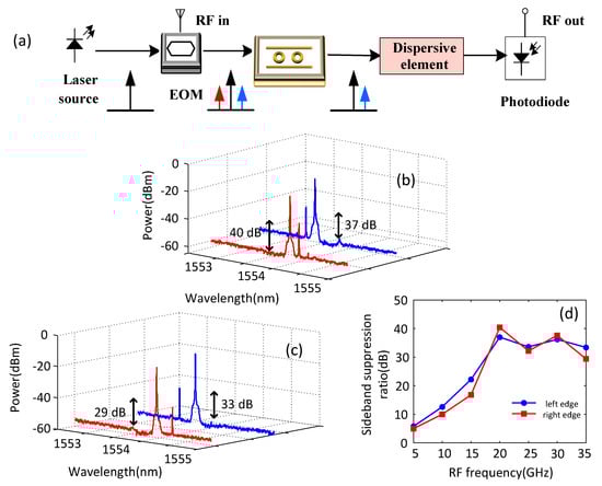 (a) Schematic of the experimental setup of the OSSB modulation system, (b) experimental results of the measured OSSB at 20 GHz, (c) experimental results of the measured OSSB at 35 GHz (where the blue line represents the upper sideband suppression of the left edge while the red line represents the lower sideband suppression of the right edge of the fabricated dual-ring weak EIT-like notch filter), and (d) the sideband suppression ratio as a function of frequency from 5–35 GHz.