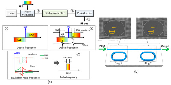 - Ehteshami, N.; Zhang, W.; Yao, J. Optically tunable single passband RF tilter based on phase-modulation to intensity-modulation conversion in a silicon-on-insulator microring resonator. In Proceedings of the IEEE International Meeting on Microwave Photonics (MWP), Paphos, Cyprus, 26–29 October 2015; pp. 1–4. [Google Scholar]