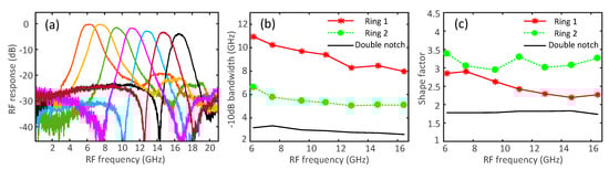 (a) Measured RF responses, (b) −10-dB bandwidths, and (c) shape factors at −10-dB/−3-dB bandwidth for single passband microwave photonic filter based on single and double notch filters.