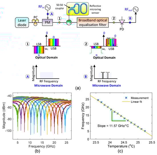 Direct optical-domain to RF-domain mapping by manipulating the two sidebands of an optical carrier provides a potential effective realization of a microwave resonant based optical sensing system [83,84]. Conventional approaches operate by converting a change in the measurand into (i) an optical wavelength shift in the resonance spectrum, which is then interrogated by an optical spectrum analyzer (OSA) [85,86], or (ii) into an intensity variation [87]. Both these approaches are limited by the interrogation speed and resolution, especially when using microring resonators where degradation in the quality (Q) factor due to fabrication errors arising from processing uncertainties is inevitable. Alternative hybrid approaches using OEO based sensors by means of a SOI based single all-pass microring resonator [82] are also largely dependent on the bandwidth of the optical filter due to the mode selectivity, which means a high-Q microring resonator is still essential and critical in the system. To address these issues, we recently reported a novel microwave photonic sensing interrogation technique to provide high notch rejection with narrow width throughout the entire sensing range in combination with a reflective SOI based microring resonator based optical notch filter as a sensing probe, as displayed in Figure 4 [88]. By adjusting the rejection depth of the optical broadband notch enhancement filter, the two sidebands can be made equal in amplitude, while they have an anti-phase relationship, thus an ultra-high rejection is achieved after detecting the photocurrent, thus removing the need for a high-Q microring optical notch filter. Since the microring is essentially a point sensor, it also enables the capability to perform remote measurements at locations with limited accessibility. This system adopts a simple configuration, requiring only a fixed laser diode, a conventional phase modulator (PM), a wideband optical notch equalization filter, a reflective single microring as a sensing window, and a photodiode (PD) to convert and enlarge the temperature changes in the microwave photonic/RF domain. The complexity and cost of the system can be further reduced by implementing the broadband optical equalisation filter by means of a fixed optical notch filter in practical applications. A temperature sensor has been demonstrated experimentally as a proof-of-concept. When ambient temperature was varied between 23.69 °C to 25.37 °C, an ultra-high notch rejection of the microwave photonic filter of about 60 dB has been achieved over a large RF range, as depicted in Figure 4b. A small, temperature-dependent shift in the optical resonant frequency leads to a large change in the RF notch frequency location that produces a high sensitivity of 11.57 GHz/°C, as illustrated in Figure 4c. It demonstrates the ability to convert a 0.03 °C small temperature change, which is limited by the equipment resolution of the temperature controller, to a significant frequency shift as large as 324 MHz, whereas by comparison if conventional optical spectrum interrogator techniques were used such that a minor temperature change would not be detectable. This demonstrated a sensing probe system that is robust, easy to be operated, and creates more flexibility for various point measurements with significantly improved sensitivity, which is highly attractive for applications that require accurate detection.