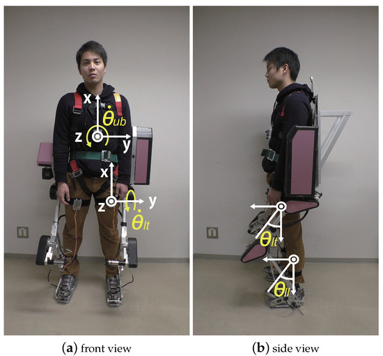Figure 1 and Figure 2 show the powered exoskeleton, designed and developed by Activelink Co., Ltd., Nara City, Japan [12], used in this research. It consisted of four geared motors and rotary encoders at the knee and hip joints. Their joint angles were controlled by PID controllers. There was no motor at the ankle joints. The degrees of freedom of the joints are shown in Figure 1a. The powered exoskeleton bound a wearer only at his/her shoulders and feet. There was no binding at the limbs of the upper and lower legs, as in conventional powered exoskeletons. The wearer could move his/her knees freely, especially at the beginning of the motion. The powered exoskeleton was designed to have comparatively small torque, at most 50 Nm, at each joint so that the back-drivability ensured safety in case of loss of control. Therefore, the powered exoskeleton was not designed to support all loads on the wearer, but only part of it.