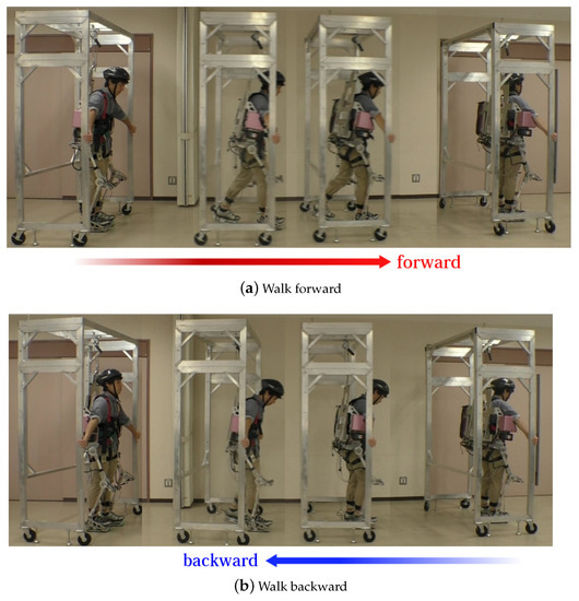 An additional 15 kg weight was placed on the powered exoskeleton in the experiments. The proposed method and the competitive methods described in Section 4.1 and Section 4.2 were applied to the powered exoskeleton one by one across enough breaks for the wearer. Figure 8 and Figure 9 show the image sequences of the motion “walking forward” and “walking backward” based on each method. The images were captured from a side. The motion category recognition worked perfectly based on the proposed method and the foot force switch-based method. Table 1 shows the walking speeds for “walking forward” and “walking backward” based on each method.