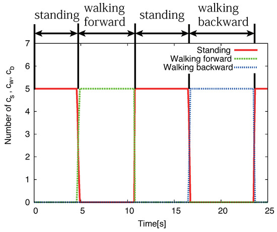 Figure 7 shows the results of the estimation of the wearer’s motion based on the proposed method. The wearer first stood in the upright position, started walking forward, stopped, and stayed still there for a while; he then walked backward, and stopped. The figure shows that the proposed method successfully recognized the wearer’s motion. The sampling time of the control system was approximately 80 milliseconds. The calculation of the motion recognition takes only about 20 milliseconds on the controller. The calculation of the whole control system including sensor value acquisition and motor control takes less than 80 milliseconds so that the powered exoskeleton assists the wearer’s motion in real time.