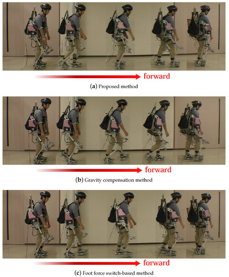 Figure 11 and Figure 12 show that there are differences of the gate frequencies of the walks. The wearer with the gravity compensation method (b) walks slower than the other methods (a) and (c). The wearer with the gravity compensation method (b) needs to push the powered exoskeleton forward and backward by his legs intentionally because the gravity compensation method (b) just compensates for the gravity effect of the powered exoskeleton and does not support the current human motion. On the other hand, the proposed method (a) and the force switch-based method (c) support the walk motion actively so that the wearer can walk faster. Figure 11 and Figure 12 show that there were differences in the gate frequencies of the walks. The wearer using the gravity compensation method (b) walked slower than with methods (a) and (c). The wearer using the gravity compensation method (b) needed to push the powered exoskeleton forward and backward using his legs because this method (b) only compensates for the effect of gravity due to the powered exoskeleton and does not support the human motion. On the other hand, the proposed method (a) and the force switch-based method (c) supported the walking motion actively such that the wearer could walk faster.