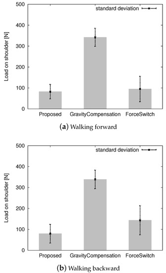 Figure 10 shows the average load on the wearer’s shoulder while walking forward and backward. The proposed method and the foot force switch method maintained a load of approximately 100 N whereas the gravity compensation method maintained one of 350 N. If there was no assist control, the wearer had approximately 350 N on his shoulders. The proposed method successfully reduced the load. It depends on the motion database D. When the datasets for the database were sampled, the powered exoskeleton was hung up on the gantry so that the wearer had no load due to the exoskeleton. Therefore, the proposed method lifted the exoskeleton. To maintain the back-drivability of the powered exoskeleton, we kept the control gain as small as possible. An approximately 100 N load on the shoulder was imposed because of the small control gain for back-drivability. The gravity compensation method did not reduce the load on the wearer’s shoulder. If the control gains and in Equations (3) and (4) became large, the load on the wearer’s shoulder in the upright position became small, but it became challenging for the wearer to swing the leg because the powered exoskeleton tried to keep the leg as vertical as possible. It eventually lost back-drivability. To retain back-drivability, the control gains and needed to be small, in which case the system failed to reduce the load on the wearer’s shoulder. The foot force switch-based method was as good as the proposed method according to Figure 10.
