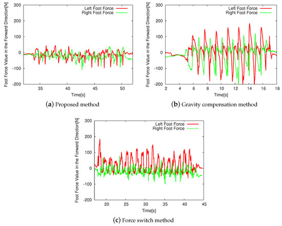 Figure 13b suggests that the proposed and force switch methods successfully support the feet of the users when they walk forward but the force switch method failed to support them when they walk backward. The evaluation of the gravity compensation method depends on the user’s preference. This result is also consistent with the discussion on Figure 11 and Figure 12.
