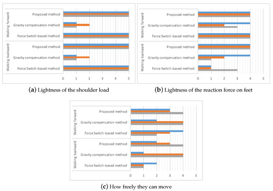 Figure 13 shows the results of the questionnaire. According to Figure 13a, they were aware of the lightness of the shoulder load if the proposed and the force switch methods applied. The gravity compensation method failed to reduce the shoulder load. The answers are consistent with the discussions on Figure 10.