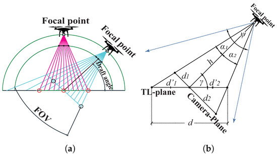 The image orthorectification process corrects the adverse effects using the geometric relation between different angles and known distances; this relation is displayed in Figure 5b, where each parameter is described as follows: