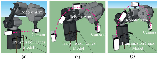 Finally, we developed an experiment, called circular variable path, that gathers the first two cases, as shown in Figure 7c. The camera plane rotates around the power-lines plane as it is not aligned with the power-lines direction. It is interesting to note that the camera positioning, in magenta color, converges to its reference in blue color and positioning errors were within expected and suitable ranges for this application, as shown in the statistical analysis developed in Table 2c. The algorithm accuracy was higher than in the three-phase system detection.