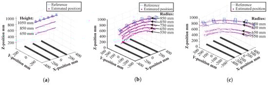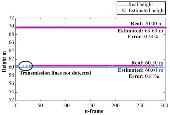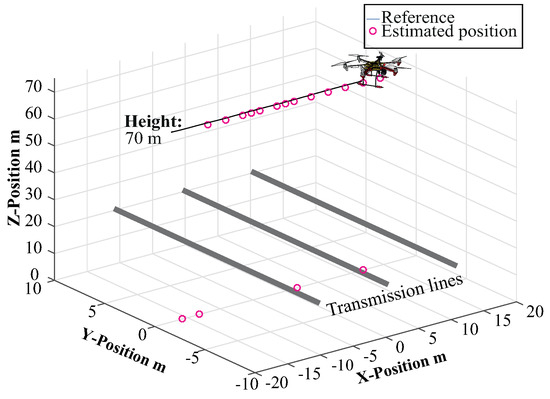 The first experiment consisted of moving the positioning system in a straight line path at three different heights, maintaining the camera plane fixed and parallel to the power-lines plane, as shown in Figure 7a. A database with 600 visual images was analyzed to investigate the behavior of the positioning system in each trail. It is possible to observe that the camera positioning (magenta dots) converges to the reference (blue dots) in Figure 7a for each studied height. In terms of the root medium squared error (RMSE), our approach was within this tolerance limit for this type of applications [57,58]. Furthermore, The algorithm accuracy was higher than in the three-phase system detection, as shown in Table 2a.