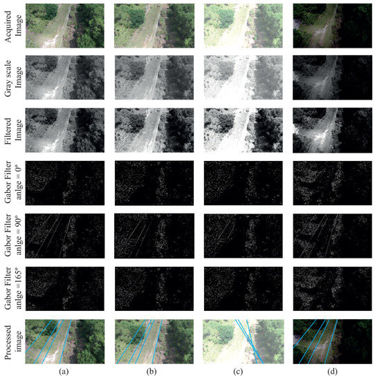 In this context, several works are focused on overcoming positioning issues. Piloted airborne platforms equipped with artificial vision systems are an alternative for solving many problems related to UAVs [11,38]. Capturing remote sensing data from satellites is also a possible solution, but it has several restrictions related to the unfavorable revisit time and spatial and spectral resolutions [39]. An artificial vision system mounted in an UAV has the potential to fill this gap, by providing a cheap and flexible way to gather the transmission line information while carrying out the inspection process [40,41]. The images are processed with the purpose of detecting faults [42] and vegetation [43] or to extract power-lines for analysis [44,45]. Power wires can be detected using a line segment detection algorithm [46] or Hough transform with parallel constraint [47]. Visual inspection is a line with great application for aerial robots, since it offers the feature of capturing images in dangerous areas with difficult access [48,49].