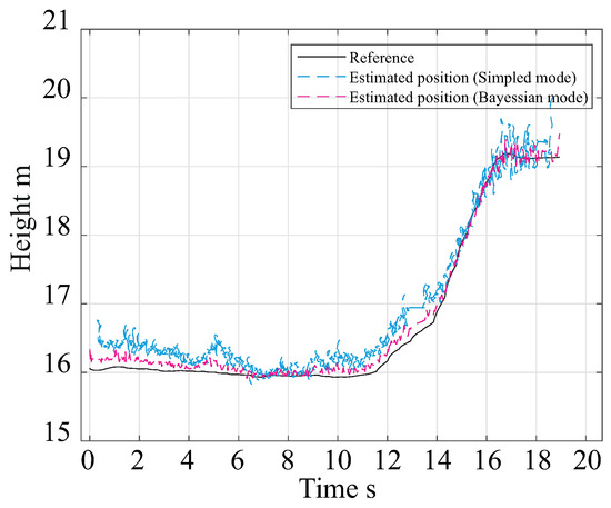Visual-based positioning cannot be applied if the transmission lines are not visible since any outcome can be returned by the system under such circumstances. However, the robotic platform has two additional sensors (IMU and GNSS receiver), with different probability density functions (pdf), estimating the spatial positioning of the UAV. This information can be used with any Bayesian method to estimate the system placement. With this aim, in this work was implemented the maximum likelihood estimation [54], associating a Gaussian probability density function to each sensor. The corresponding analysis presented in Equations (7) and (8) reveals that the new estimation is a weighted average and the new uncertainty can be generated through addition of the reciprocals: