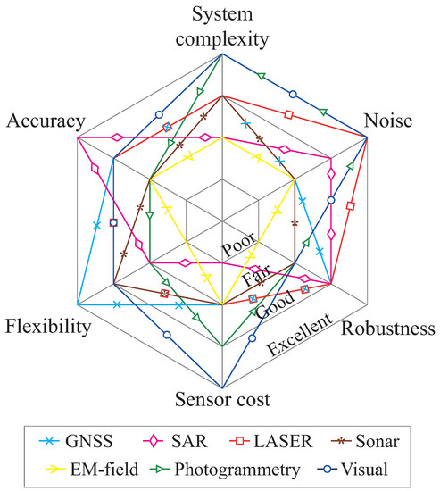 Existing positioning architectures are broadly classified as proprioceptive and exteroceptive by this manuscript. By regarding this separation and the frequency of preference, some leading positioning methods are discussed, and a detailed comparison is shown in Figure 15 and the main characteristics are summarized in Table 6.