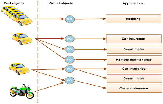 In Figure 1, cars represent an automobile manufacturing company. Real objects are represented by cars and bikes, and the term virtual object, represents a relationship. Each virtual object is associated with a single car or a number of cars [4]. When a customer needs to buy a car, the virtual object could be used to register the car with an insurance company or to obtain remote maintenance from an automobile manufacturing database. Here, we can perceive a virtual object as being created with more than one association. In addition, if a customer is registered with a single virtual object that can handle different types of services offered by an automobile manufacturing company, such as car insurance and smart meters, the concept of the many-to-many association appears.
