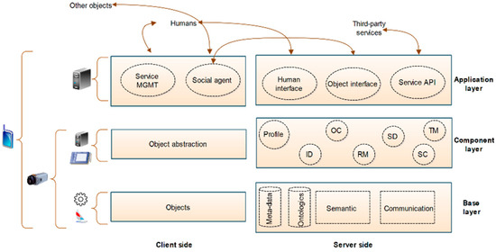 We refer readers to a recent social IoT-based model suggested by Nitti, Atzori [14]. In this model, the authors proposed a possible approach to solving various issues, like service discovery and composition. They introduced a novel paradigm comprised of three main layers: the base layer, the component layer, and the application layer, as described in Figure 3 Nitti, Atzori [14]. The base layer includes services for databases, semantic engines, and communication. The component layer is used as a host tool for satellite component implementation, and the application layer acts as an interface between objects and humans. This layer is used to provide connection services. On the left-hand side, the client is divided into a further three layers: objects, object abstractions, and social agents. The objects layer is comprised of physical objects. The object abstractions layer acts as an interface between the attached devices. This interface is controlled by common languages. The third layer is comprised of a number of agents, and its function is to make connections between attached objects and social IoT–based servers. Service management provides two services: one is an interface and the second monitors and controls the behavior of objects. This architecture provides a basic building block for the entire social IoT domain.
