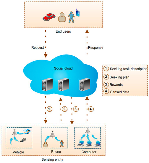 Figure 4 explains the general scenario of crowdsourcing used in the social IoT. It comprises three entities: the social cloud, end users, and sensing [16]. Here, the sensing entity holds various types of data, e.g., vehicles, phone users, and computer data. The social cloud is used to process the data complying to its type. When the end user requests a specific type of data, the steps in providing the requested service are as follows. First of all, the request is processed in a social cloud according to a specific sequence of instructions. Afterward, the request is sent to the sensing entity, which forwards this request to the social cloud. Finally, it will be sent again as feedback to the end user. This scenario describes the structure of a social IoT-based network.