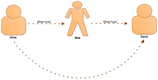 The concept of trust is not new: it has frequently been studied in numerous disciplines, including psychology and the computer sciences [28]. It remains very hard to keep to a precise discussion regarding the concept of trust. This is due to its extensive use in different dimensions and disciplines. Before building trust, the trustor and trustee agree with each other on matters like time, location, activity, etc. There are some key properties of trust, in general, including transitivity, comparability, personalization, and asymmetry. A general example of using trust is explained in Figure 5. If a person named Alice trusts her friend Bob, and Bob trusts his friend Carol, then it means Alice can trust Carol. Transitivity or transitivity relations have remained the most significant and controversial phenomenon in the past. This is the ability to trust someone who is not directly known [1]. In real life, we can say that trust is not always transitive, and it mainly depends on the particular service that was requested earlier [29]. Computability is a reference point for trust components, and is the ability to compose trust for different people [30]. In conclusion, trust composability is the power to make a decision for people. Keeping this fact in mind, when we assign different values to different friends, there exists a need for a composition function that provides a service. The benefit of the composition function is to increase the accuracy of the results that are populated during the computation. People in a social IoT environment always remain careful, but doubtful, because they are always worried about their privacy and the disclosure of confidential data [31].