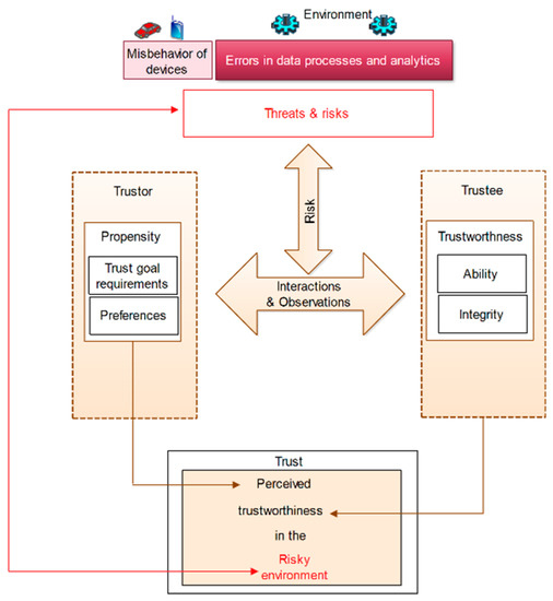 Figure 6 demonstrates an ideal conceptual trust-based model for social networks. In this model, trust will be attained by making a connection between trustors (who behave in a particular way under the environmental conditions) and trustees. This procedure is called harmonization [32]. Usually, harmonization is achieved by accumulation, and an observation is made by trustors about trustees. The environmental conditions between two parties (for either the trustee or the trustor) are considered risks that are taken during each interaction and observation. The trustor’s authority is not limited to handling the requirements of the trustor’s preference and to the trust of the trustee [32]. In this case, environmental conditions, such as threats and risks, remain topmost concerns. Friendliness is another property, and it is used to find neighbor objects by making social relationships among them. The social IoT model explained in Nitti, Atzori [14], states that every node in a network is an object, and it is capable of establishing a social relationship with other objects according to rules set by the owners [33]. There are several types of relationship, given as follows.