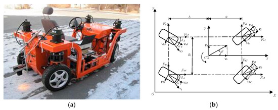 The picture of 4WIS/4WID electric vehicle is shown in Figure 1a. All the wheels of the vehicle can be independently steering and driving. In Figure 1b, the 3-degree of freedom (DOF) nonlinear vehicle dynamics model is applied to present vehicle dynamics features. In this model, the longitudinal degree of freedom is added to the normal two-degree-of-freedom model. Since this research mainly takes into account lateral, longitudinal, and yaw dynamics, other vehicle motions here, such as pitch, roll, and vertical motions are neglected in the presented vehicle model [25].