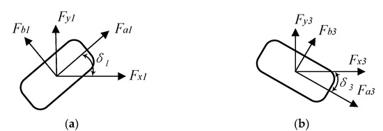 As shown in Figure 2a,b, the tire forces of each wheel in the x direction and y direction are related with the wheel steering angle δi (i = 1, 2, 3, 4) and longitudinal and lateral tire force Fmi, Fni (i = 1, 2, 3, 4), respectively, which can be expressed by matrix form:
