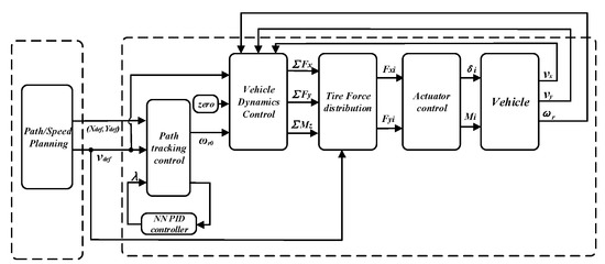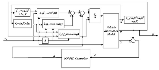 The block diagram of the path tracking control layer is shown in Figure 5. The inputs of the system are the desired vehicle speed and desired trajectory function. The outputs are the vehicle yaw rate.