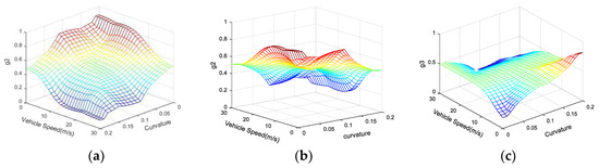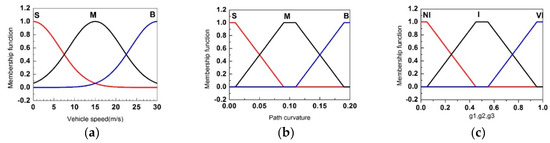 Since the three subsets of S, M and B are a relatively fuzzy definition of vehicle speed, it is considered that the decay of membership function with the change of vehicle speed is not linear. Therefore, we adopt the Gaussian-type membership function for , as shown in Figure 9a. For and , , , experience shows that when the membership function changes linearly with the parameters, the control strategy has better control effect. Hence, by utilizing the expertise-based method, the Triangular-type membership function is decided. It is adopted for and , , . The membership function curves of and , , are shown in Figure 9b,c.