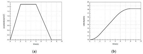 The reference path profile used in simulation is a polynomial curve with small curvature radius. Figure 12 shows the desired acceleration and velocity of the test vehicle. The vehicle starts the run at initial velocity 20 m/s. As shown in Figure 12a,b, the vehicle begins to accelerate from zero, then it runs at a constant speed of 18.2 m/s. The above condition demonstrates that the vehicle runs at a case of high vehicle and small path curvature, which can verify the control effect.