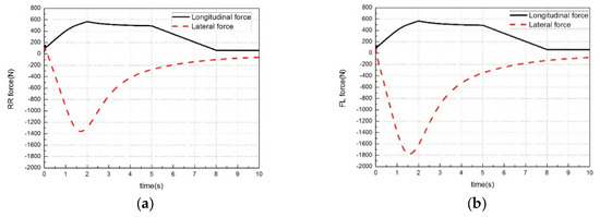 Desired tire lateral and longitudinal forces from tire force distribution layer for the four wheels during the automatic driving are shown in Figure 13. It is clear that when the autonomous electric vehicles runs at an accelerated velocity in the road with small curvature, the desired longitudinal force of each wheel is about 500 kN, which is devoted to ensure the vehicle motion in longitudinal direction. Simulation results show that the presented control distribution algorithm in the multi-objective hierarchical control architectures can be used to obtain preferable distribution results.