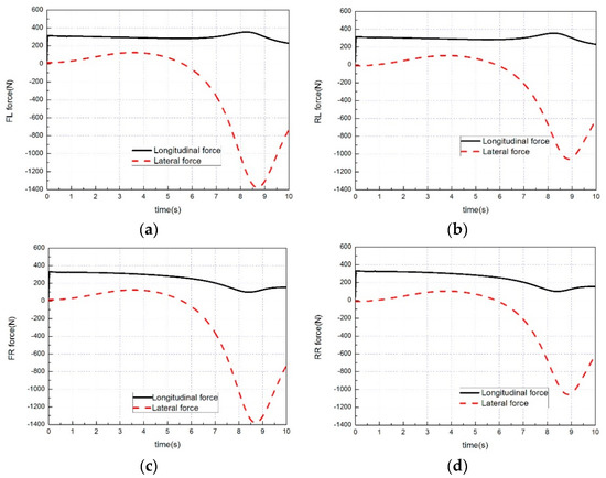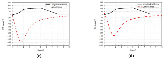 Desired tire forces provided by the tire Force Distribution layer: (a) Front left tire force; (b) front right tire force; (c) rear left tire force; and (d) rear Right tire force.