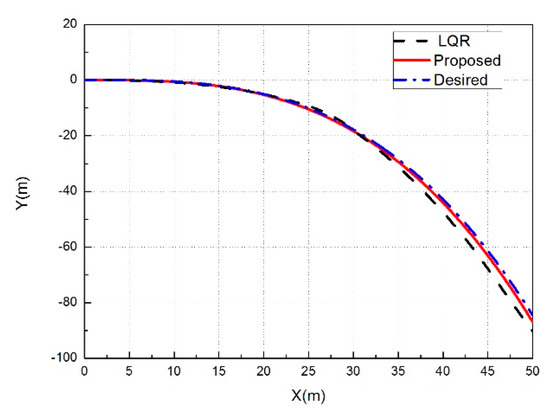 The dynamic behaviors of the proposed control architectures and the traditional LQR control system are compared in Figure 14, Figure 15 and Figure 16. As shown in Figure 14, the real trajectories are plotted together with the simulated trajectory, and the vehicle follows the path reference with an acceptable performance. It is clear that, compared to the LQR controller, the proposed architectures has less tracking error.
