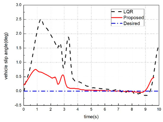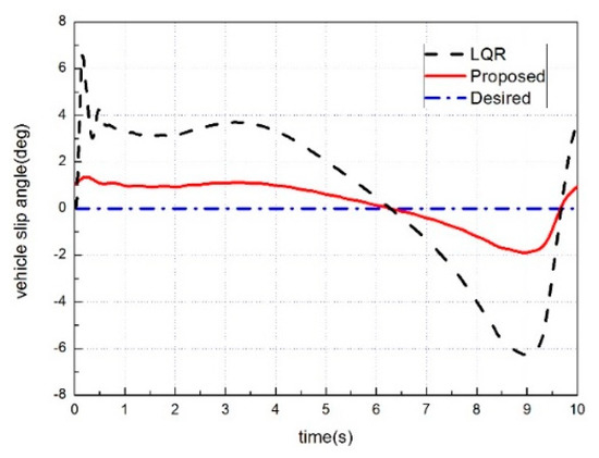 Figure 15 shows that the vehicle slip angle are controlled in a smaller range by the proposed control architecture than traditional LQR control system. The results show that the proposed control architecture can restrict the vehicle slip angle within 0.8 deg, whereas the traditional LQR control system make the vehicle slip angle be bounded by 2.5 deg. It means that the vehicle has better maneuverability.