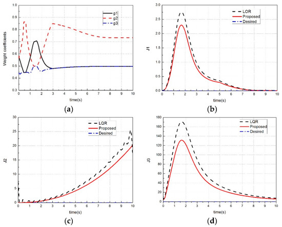 Figure 21a shows the simulation results of changeable weight coefficients in the case of medium vehicle speed and large path curvature. In the path tracking process, there are time periods when the path curvature radius is large, so the weight coefficient is large and is relatively small. However, the coefficient is relatively large in the time period of low speed and small path curvature radius. Figure 21b–d show the optimization effect of the proposed control architecture, which further proves the above conclusion.