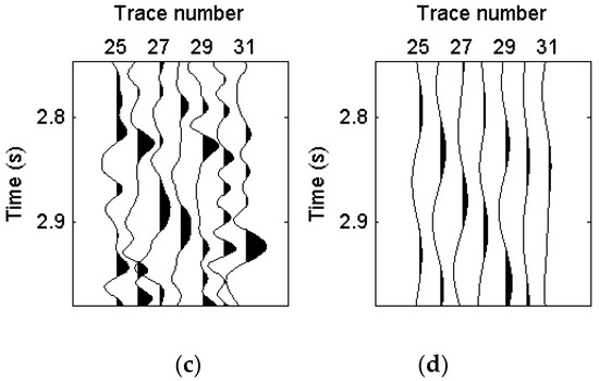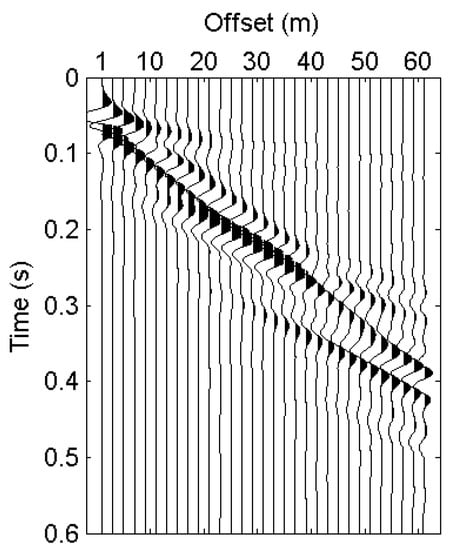 Surface waves are generally modeled as broom-like events characterized by low frequency, low velocity, and dispersion. In addition, their dispersive energy is around theoretical dispersion curves in the f-v domain [19,20]. Therefore, frequency-domain high-resolution LRT can, in theory, sparsely represent surface waves. Reflections are approximated by hyperbolas, and time-domain high-resolution HRT can sparsely represent reflections with the assumptions that velocities change little horizontally and reflection interfaces are almost horizontal [26]. We choose frequency-domain high-resolution LRT and time-domain high-resolution HRT to represent surface waves and reflections, respectively. To match with the matrix definition of sparse representation dictionaries in our sparse representation problem, the inverse LRT and inverse HRT correspond to the matrix signs and , respectively, while the forward LRT and forward HRT are respectively the matrices and . The matrices and are the pseudo inverse of the representation dictionaries, i.e., , . By putting and into (5), we obtain