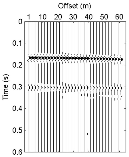 We synthesize the surface waves (Figure 1) of the two-horizontal-layer model (Model 1) described by Table 1 using the staggered-grid finite-difference method [31]. Then, we synthesize reflections (Figure 2) of the three-horizontal-layer model (Model 2) described by Table 2 using ray tracing. Frequency-domain high-resolution forward LRT and time-domain high-resolution forward HRT are applied to the surface waves and reflections to obtain the four panels of the Radon coefficients. Next, we respectively normalize the Radon coefficients to unity divided by the maximum of each panel and apply hard thresholds to them. Finally, the seismic data were reconstructed by the inverse transforms. For a Radon panel, the higher threshold amplitude means that fewer Radon coefficients are used in the reconstruction.