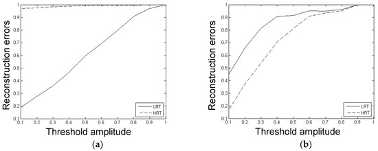 where is the reconstruction data. The reconstruction errors against the threshold amplitude are illustrated in Figure 3. According to Figure 3a, fewer coefficients can be used to reconstruct the surface waves by frequency-domain high-resolution LRT compared with time-domain high-resolution HRT, which means the former can represent surface waves more sparsely. On the basis of Figure 3b, time-domain high-resolution HRT can represent reflections more sparsely than frequency-domain high-resolution LRT. Comparing the HRT-reconstruction errors shown by dashed lines between Figure 3a,b, time-domain high-resolution HRT leads to a non-sparse representation for surface waves. Similarly, frequency-domain high-resolution LRT leads to a non-sparse representation for reflections when comparing the LRT-reconstruction errors. Thus, the two transforms (dictionaries) are significantly different in the sparse representations for surface waves and reflections, which meets the assumptions of MCA, and it is theoretically feasible to extract the surface waves based on Equation (6).