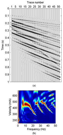 Two layered earth models (Model 3 and Model 4) are given in Table 3 and Table 4 to display the distortion of surface-wave dispersive energy caused by reflections. The layers of Model 3 are the first two layers of Model 4. A synthetic X-component shot gather (Figure 4a) of Model 3 is simulated using a staggered-grid finite-difference method [31] with an explosive source located at a 3-m depth. Another synthetic X-component shot gather (Figure 5a) of Model 4 is simulated using the same method and the same forward-simulation parameters. We simulate the records with 51 receivers evenly spaced (2 m) in line on the surface and the nearest offset of 40 m. As shown in Figure 4b and Figure 5b, the two shot gathers are transformed into the f-v domain by high-resolution LRT.