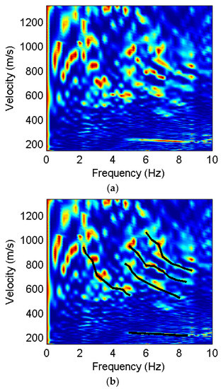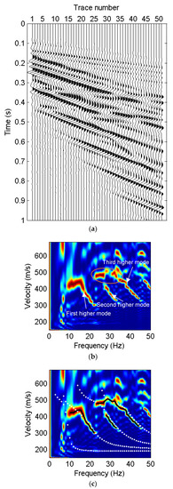 Seismic surface waves are widely used in crustal and mantle structure studies as well as engineering prospecting. They are characterized by low attenuation with offset, a high signal-to-noise ratio, and dispersion [1,2]. The dispersion characteristics of surface waves reflect the near-surface S-wave velocity structure. Dispersion curves of fundamental-mode surface waves are inverted to obtain a near-surface S-wave velocity structure for PS-wave static corrections in seismic exploration [3,4]. Recently, some studies have found that fundamental- and higher-mode surface waves have different sensitivities to elastic properties and thicknesses of near-surface materials [5,6]. Thus, joint inversion of fundamental- and higher-mode surface waves is of widespread interest for less ambiguity and higher accuracy of S-wave velocities in engineering seismic prospecting, ambient seismic noise tomography, and microtremor surveys [7,8]. To obtain accurate S-wave velocities, extraction of accurate dispersion curves of multi-mode surface waves is essential.