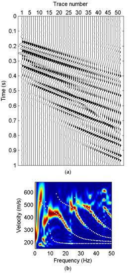 (a) An image of dispersive energy of the extracted surface waves using the proposed method and (b) dispersion curves picked from Figure 13a.