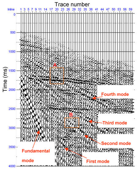 Furthermore, we compare the proposed method with other methods of surface-wave extraction to test the superiority of the proposed method. High-resolution LRT is applied to the original data and a 2D window is used to select and extract surface waves in the f-v domain. Figure 7 shows that the surface waves are mainly extracted but “mode kissing” is not changed. The f-k filtering method is also used to extract surface waves. The result of the surface-wave extraction consists of residual reflections in Figure 8a and “mode kissing” is reduced in Figure 8b. However, there is also a risk of mode misidentification owing to the discontinuous dispersive energy shown in Figure 8b.