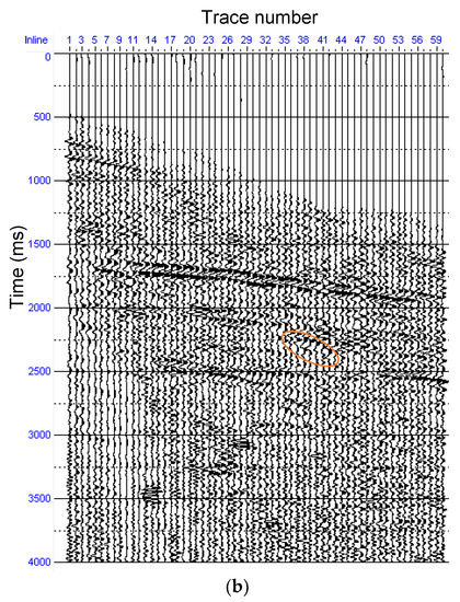 The X-component field data of 2D3C seismic data shown in Figure 9 were acquired in Wangjiatun District, Daqing Oilfield, China with a sample interval of 4 ms, a geophone interval of 25 m, and a nearest offset of 400 m. It can be seen that several events of higher-mode surface waves overlap with the reflections. The surface waves are mainly at the range of low frequencies and low velocities, while reflections are in the whole f-v domain (Figure 10). Several branches of dispersive energy at frequencies of ~5 Hz and velocities of 800–1000 m/s, circled in Figure 10, are very close to each other, resulting in inaccurate phase velocities at those frequencies. The extracted surface waves extracted by the proposed method are shown in Figure 11a, where most of surface waves are extracted, and the rest of the field data are reflections and other noises, except for a small number of surface waves (circled in Figure 11b). This is because the morphologies of the surface waves and reflections are slightly distorted by diffraction waves and other noises. These noises are caused by small-size geological subjects (pinch-outs or fractures) [33].