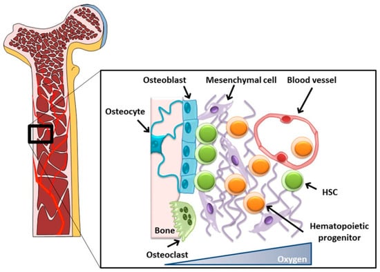 The cell niche within the bone tissue. Osteoblasts, osteocytes, osteoclasts, mesenchymal cells, and endothelial cells of blood vessels create the niches and contribute to the maintenance and differentiation of hematopoietic stem cells (HSCs). With permission from Reference [26].