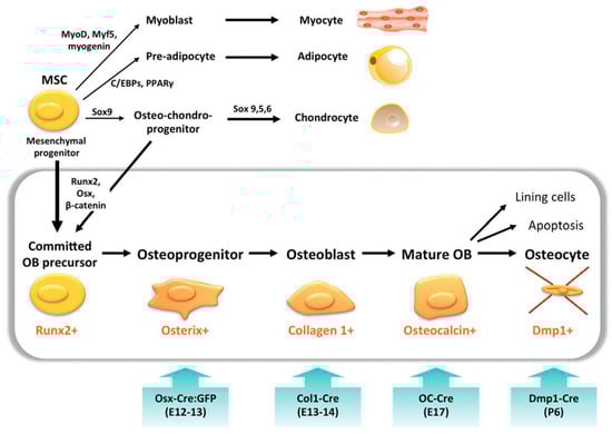 Schematic representation of the different steps of osteoblast (OB) differentiation from mesenchymal stem cells (MSC). With permission from Reference [35].