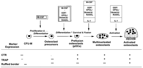 The pathways and cytokines involved in the differentiation of osteoclast progenitors into functionally active osteoclast. With permission from Reference [58]. CTR: calcitonin receptors, TRAP: tartrate-resistant acid phosphatase.