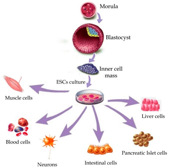 The first reports regarding the successful isolation of ESCs from the inner cell mass (ICM) of blastocysts were related to the experiments performed by two groups coordinated by Evans and Martin in 1981 [60,61]. In addition to the mouse, scientists have also succeeded in the isolation of ESCs from other species including non-human primates (like the rhesus monkey) and humans [62,63]. Although there are ethical issues about the isolation of ESCs in the case of humans [64], new approaches such as in vitro fertilization (IVF) and nuclear cloning have been developed to remove these problems [65]. Under the defined conditions, these cells can differentiate into all the three germ lines (Figure 4).