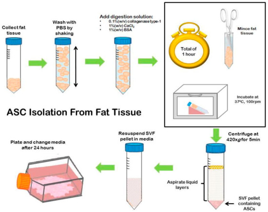A representative schematic of ASCs isolation from fat tissue after digestion, isolation of stromal vascular fraction (SVF), and plating of SVF. Reproduced with permission from Reference [198].