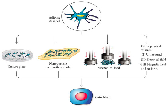 Schematic illustration of various stimulating factors affecting the differentiation ASCs towards osteoblasts. With permission from Reference [206].