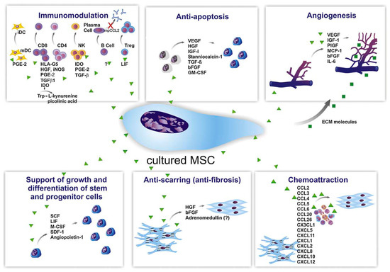 - Da Silva Meirelles, L.; Fontes, A.M.; Covas, D.T.; Caplan, A.I. Mechanisms involved in the therapeutic properties of mesenchymal stem cells. Cytokine Growth Factor Rev. 2009, 20, 419–427. [Google Scholar] [CrossRef] [PubMed]