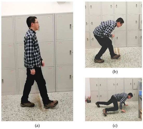 Different moving patterns in intrusion scenarios. (a) Regular walking; (b) walking while bending down; and (c) creeping.